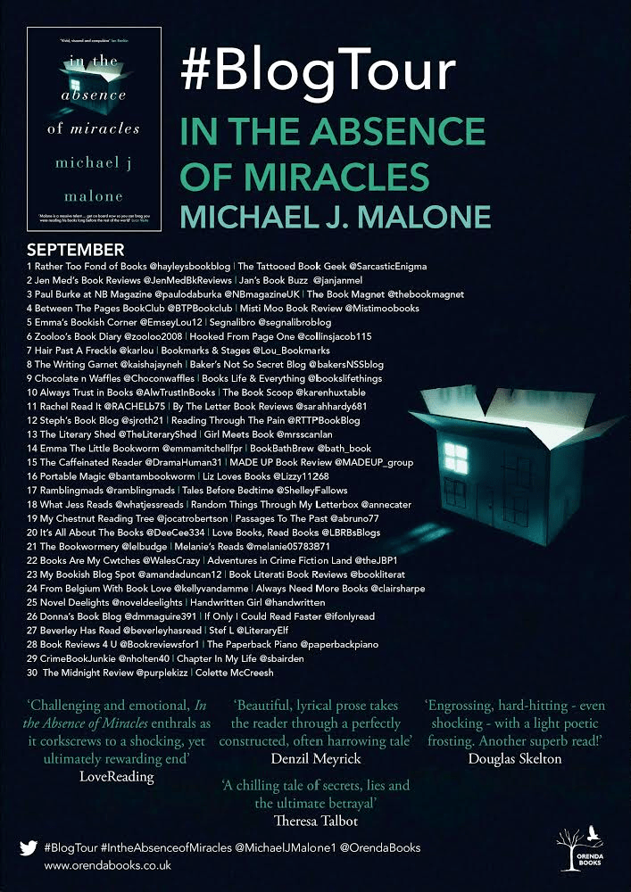 Many thanks to Orenda Books for an eCopy of In the Absence of Miracles by Michael J Malone and to Anne from #RandomThingsTours for the invite to read and review. Like to check out the rest of the tour? Here’s the list…