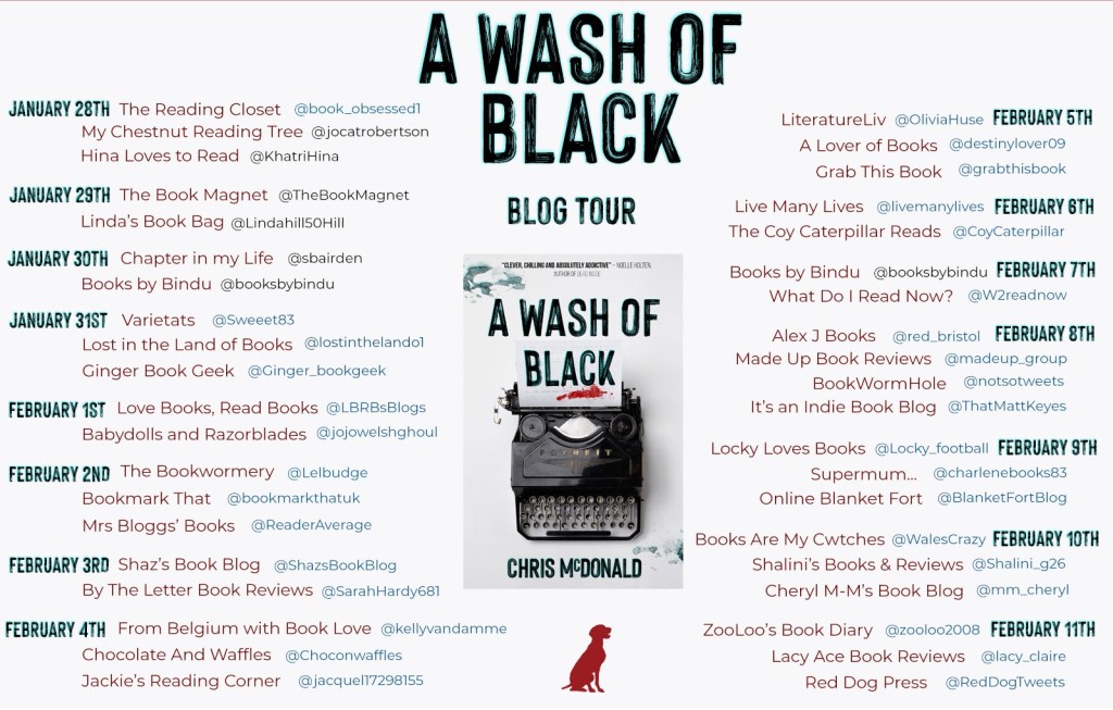I came across Chris McDonald a couple of years ago on Twitter – ‘just’ a fellow book blogger! Even then he must have been working away at his own book. So it was lovely to see the tweet saying he had a contract for A Wash of Black with Red Dog Press. Then when I saw that bloggers were needed to review, how could I not?