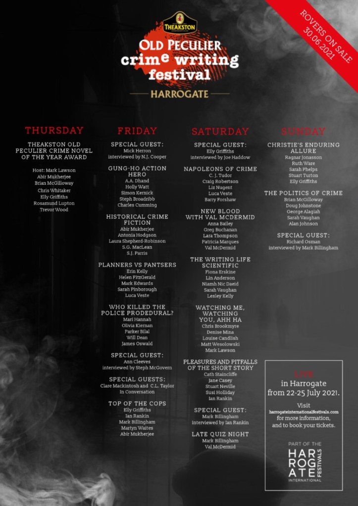 This year’s Theakston Old Peculier Crime Writing Festival continues until Sunday at the Old Swan Hotel, Harrogate. Special Guests this year include Mark Billingham, Ann Cleeves, Elly Griffiths, Mick Herron, Clare Mackintosh, Val Mcdermid and Richard Osman, curated by Festival Programming Chair Ian Rankin OBE.